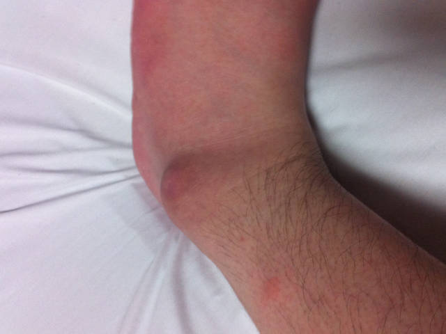 この滑液のおかげで摩擦が少なく関節が曲がるのですが、この滑液が急な激しい運動で大量に造られ、どうも漏れてしまったために腫れたしまったらしいです。